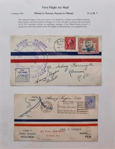 Finally, Peter Fernbank came to the floor with a display on New Constitution overprints from the Bahamas. This included Nassau–Miami first flight covers dated 2 January 1929, and covers signed by the first pilot, Harry Rogers, on both the outbound and return legs, and overprinted material marking the granting of independence to the Bahamas in 1964.
